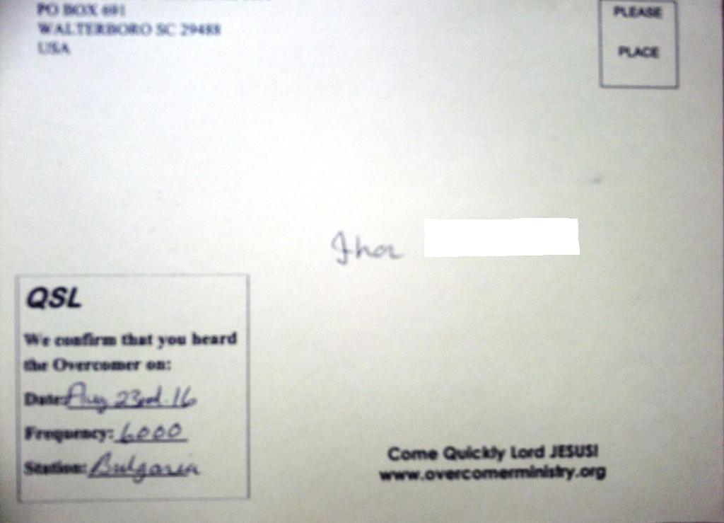 The Overcomer Ministry via Bulgarian TX confirmed my reception report by real QSL card! Thank you very much for it! E-mail: lastime@overcomerministry.org